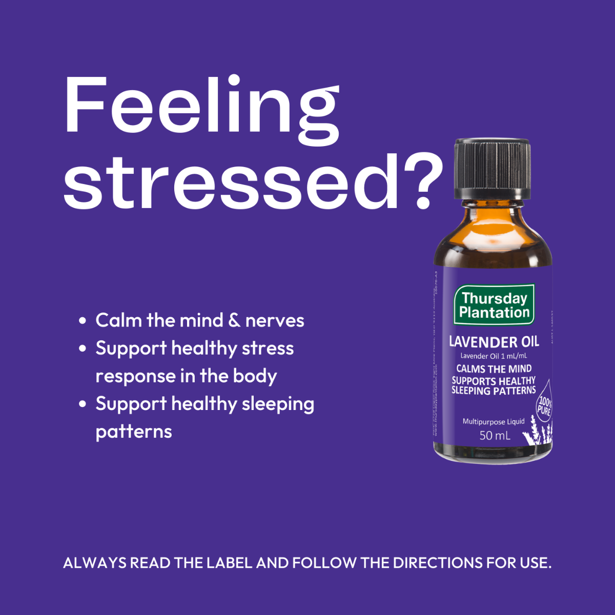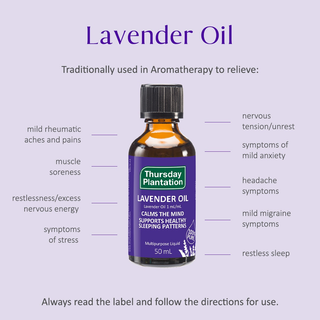 Thursday Plantation 100% Pure Lavender Oil is a versatile pharmaceutical grade essential oil, which can help soothe nerves and calm the mind. Lavender Oil calms the mind, supports healthy sleeping patterns and healthy stress response in the body. It is traditionally used in aromatherapy to relieve symptoms of stress, nerbous tension, mild anxiety and excess nervous energy. It relieve sleeplessness and induce sleep.