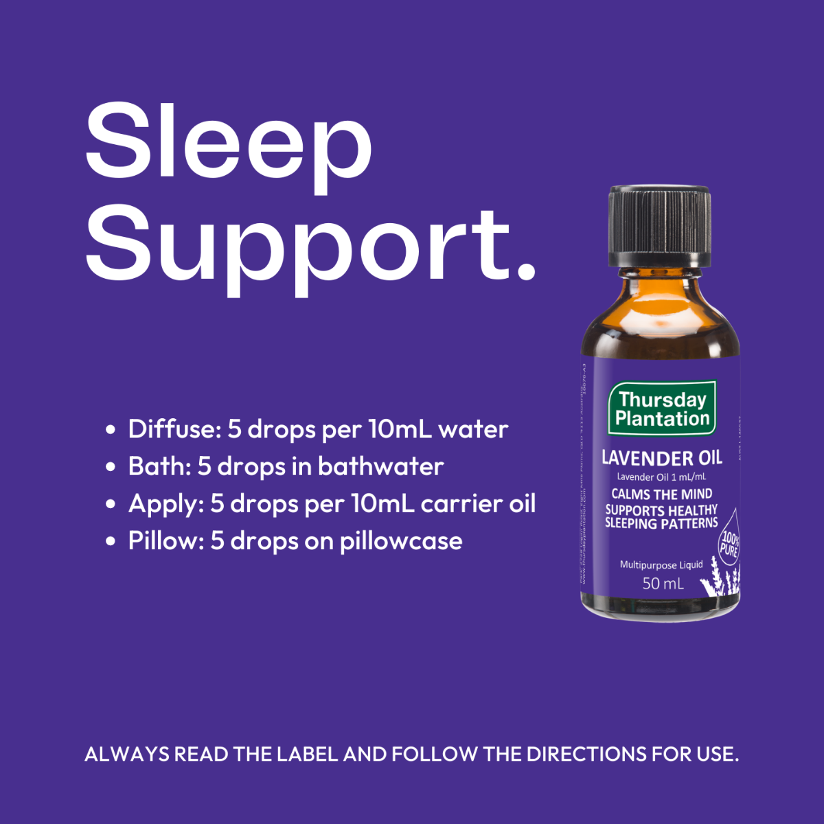 Thursday Plantation 100% Pure Lavender OilΒ is a versatile pharmaceutical grade essential oil, which can help soothe nerves and calm the mind. Lavender Oil calms the mind, supports healthy sleeping patterns and healthy stress response in the body. It is traditionally used in aromatherapy to relieve symptoms of stress, nerbous tension, mild anxiety and excess nervous energy. It relieve sleeplessness and induce sleep.Β