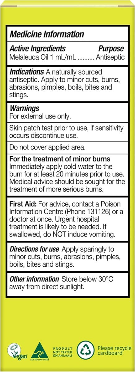 Apply sparingly to minor cuts, burns, abrasions, pimples, boils, bites and stings. Apply Tea Tree Oil directly or on a cotton bud.