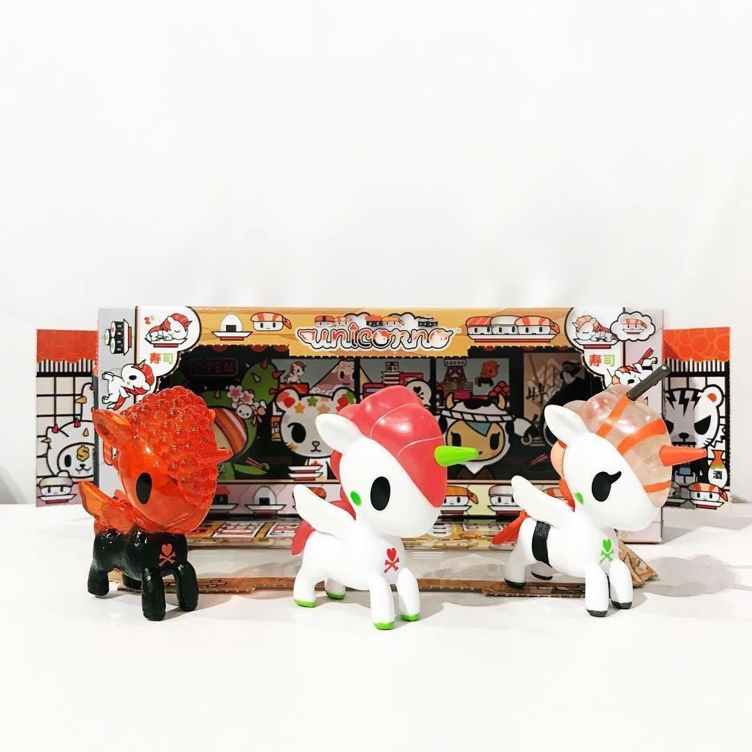 Tokidoki Sushicorno Vinyl Figure Set is a set of 3 unique tokidoki Sushicorno figurine collectibles. Ride the Japanese pop wave with this colorful, sushi-themed Unicorno 3 pack! Wonderfully detailed and super sweet, this 3 sushi inspired Unicornos will make wonderful additions to your tokidoki collection.