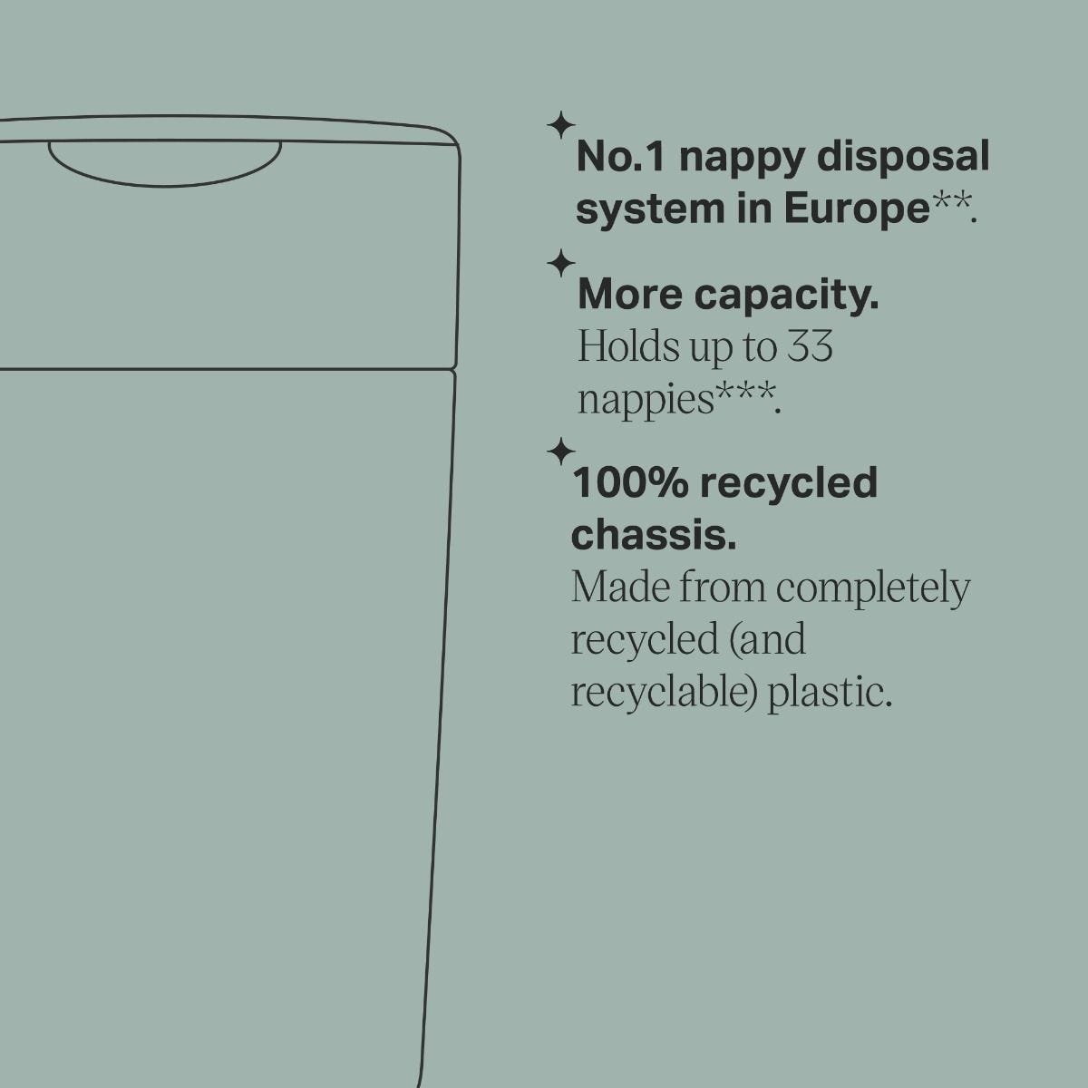 - Holds up to 30 nappies (based on using size 1 nappies (2-5kg)) meaning fewer trips to the outside bin.
