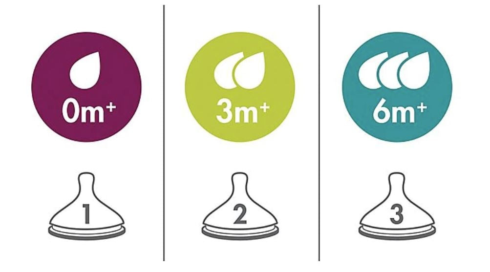 The numbers indicate the flow rate. Choose the slowest flow rate that comfortably feeds your baby. A smaller number = a lower flow rate.