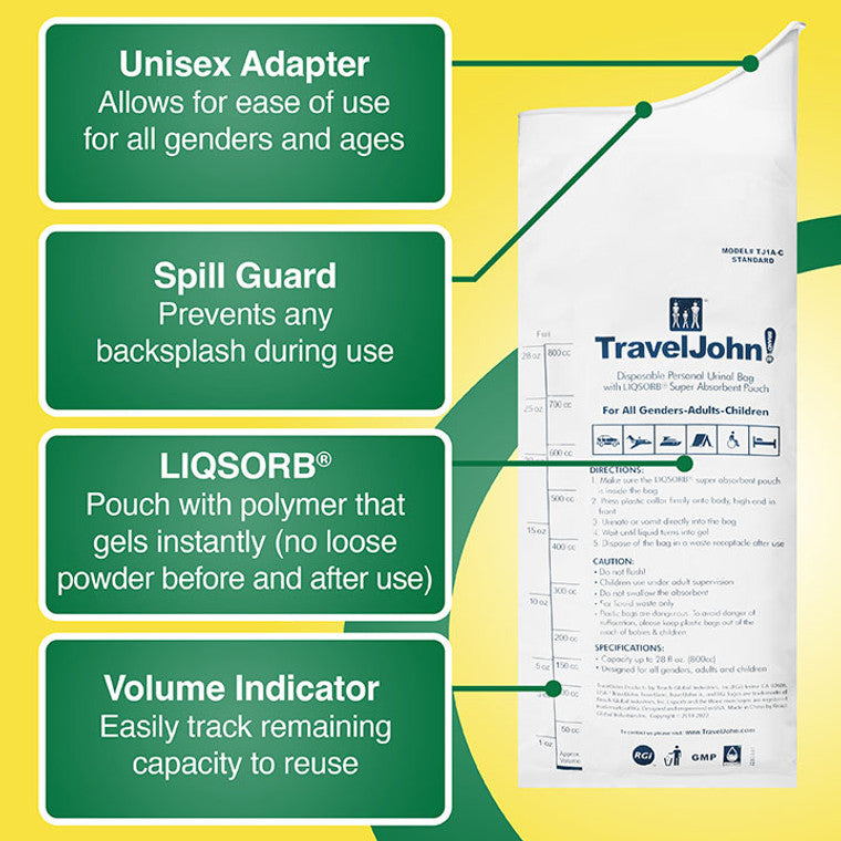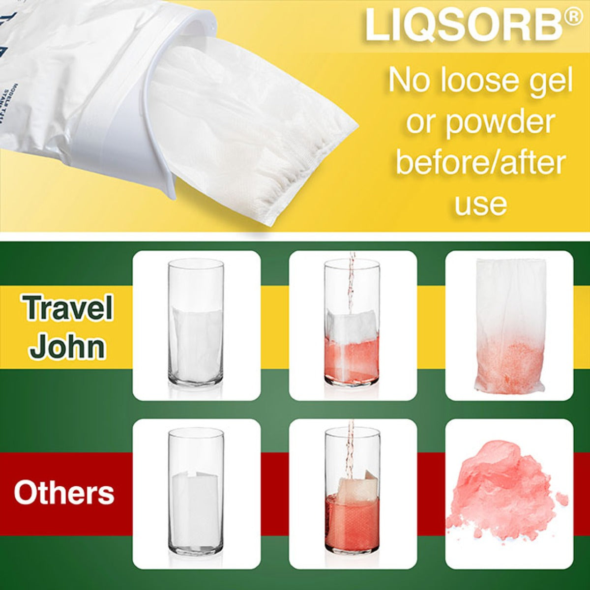 Travel John Disposable Urinal is convenient, sanitary, discrete and compact. The key ingredient is LIQSORB®, a combination of an exclusive biodegradable non-woven fabric pouch containing a biodegradable polymer substance that immobilises bacterial growth quickly. LIQSORB® absorbs the liquid waste and turns it into an odourless, spill-proof gel bag that is non-toxic and waste disposal safe.