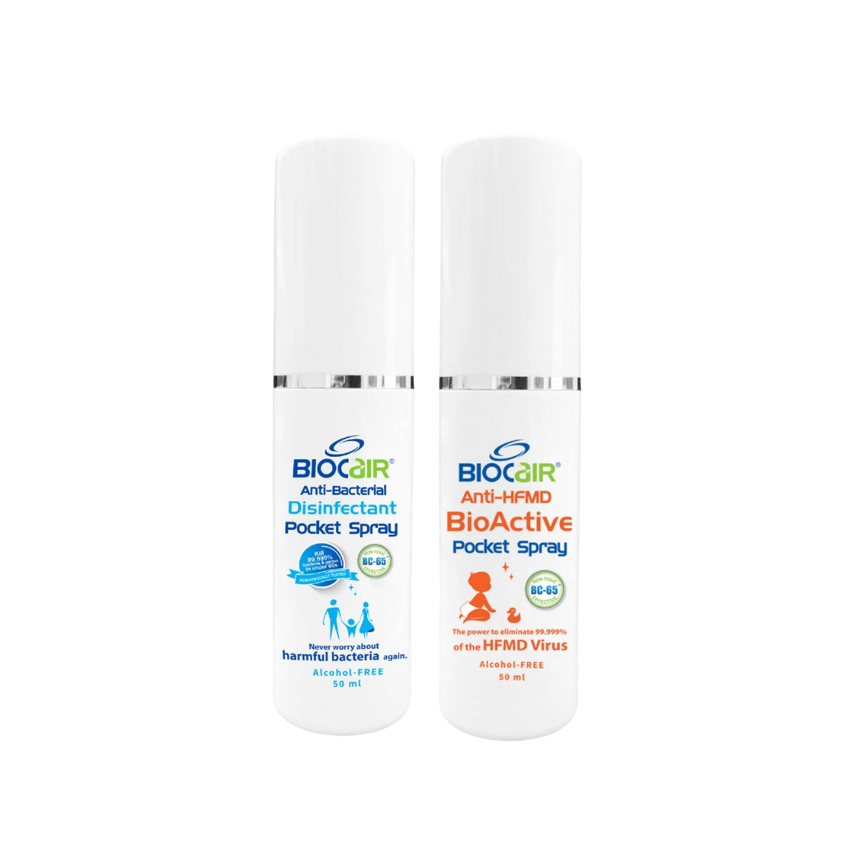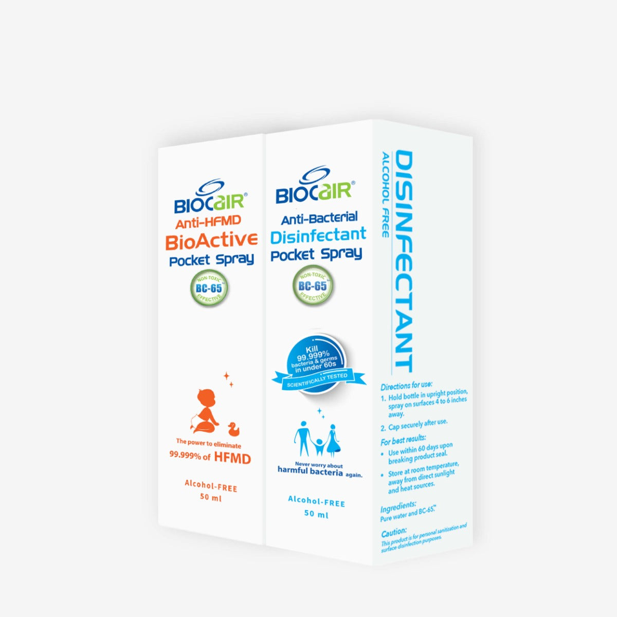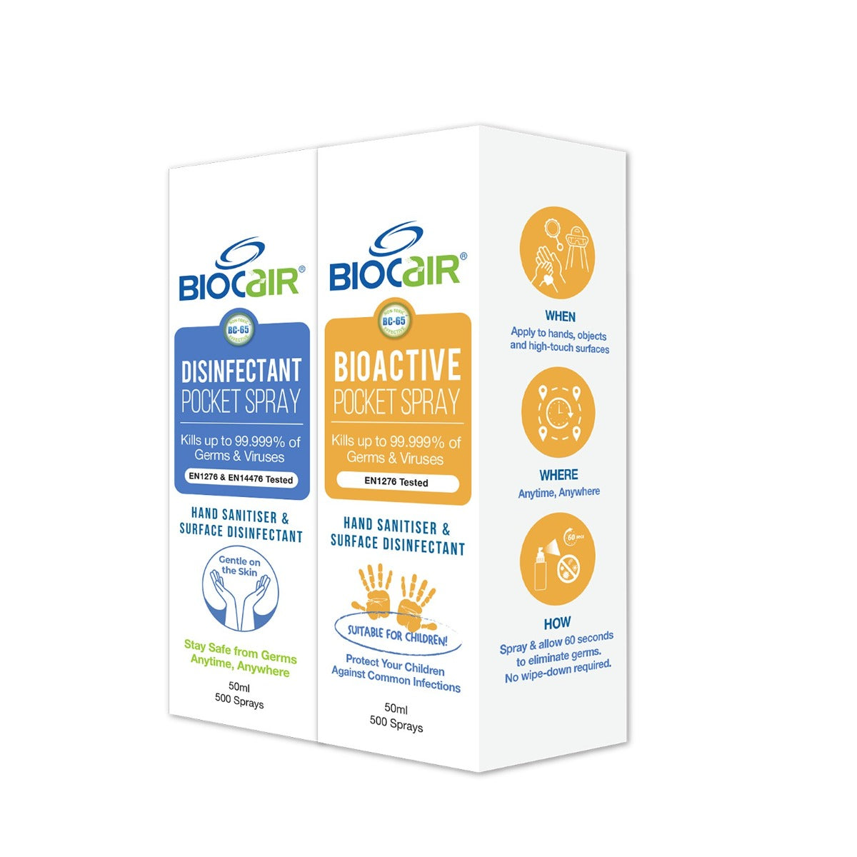 BioCair Pocket Spray combo Twin Pack, 50ml is a powerful duo includes the Disinfectant Pocket Spray and the BioActive Pocket Spray, which eliminate up to 99.999% of harmful germs and viruses within 60 seconds. Both sprays are non-toxic, alcohol-free, and perfect for daily use on hands, everyday items, and high-touch surfaces. They're gentle on sensitive skin, leave no residue, and don't require rinsing or wiping down. The Disinfectant Pocket Spray is ideal for sanitizing hands, electronics, toilet seats, door handles, keys, and more.