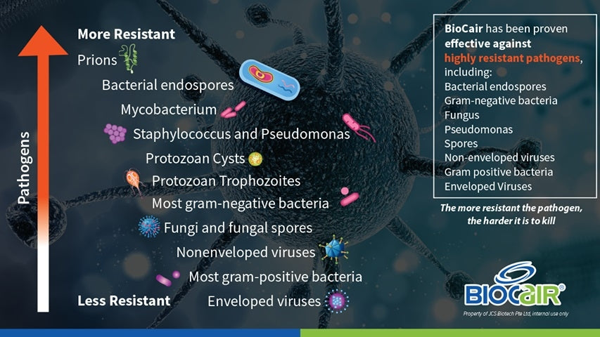 BioCair® has been tested to kill 99.999% pathogens according to the US Pharmacopoeia Standard, including the disinfectant-resistant pathogens such as Escherichia coli, Staphylococcus aureus, Pseudomonas aeruginosa, Candida albicans, Aspergillus brasiliensis and Bacillus subtilis in just 60seconds.