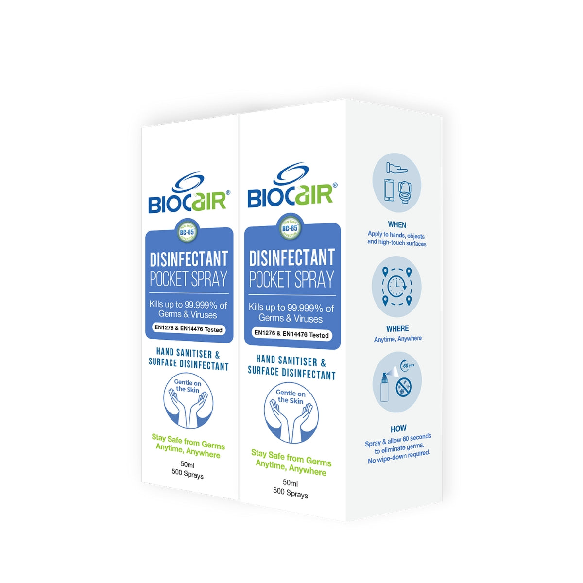 Twin Bundle includes: 2 x BioCair BC-65 Disinfectant Pocket Spray, 50ml ONLY