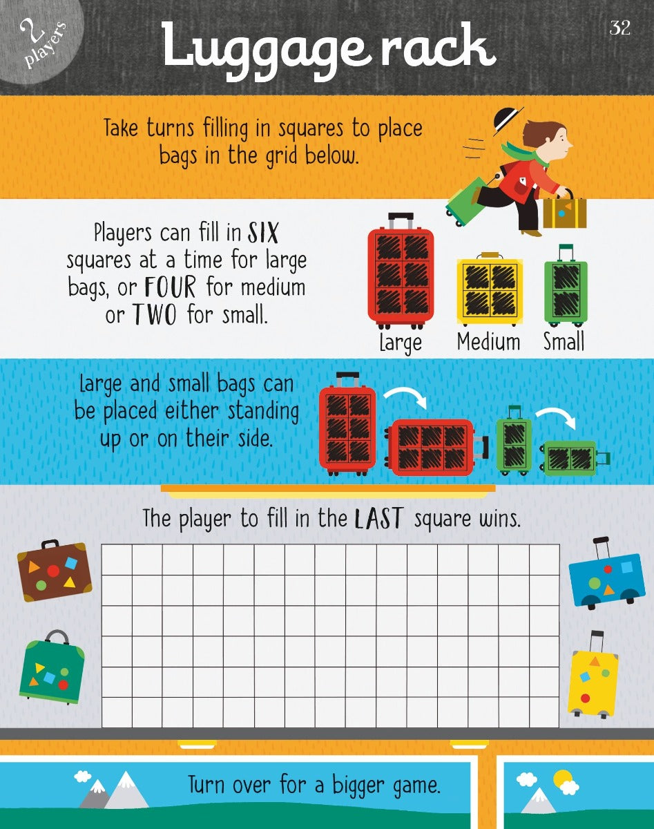Usborne Never Get Bored in a Train Puzzle & Games is a write-in activity book that keeps children occupied and entertained on the train. The essential companion to every train journey. This write-in book is easy to dip in and out of on short trips, again and again, or distract and entertain you on long journeys for hours and hours. It's bursting with mind-bending puzzles, fun activities and exciting games you can play on your own or in a group