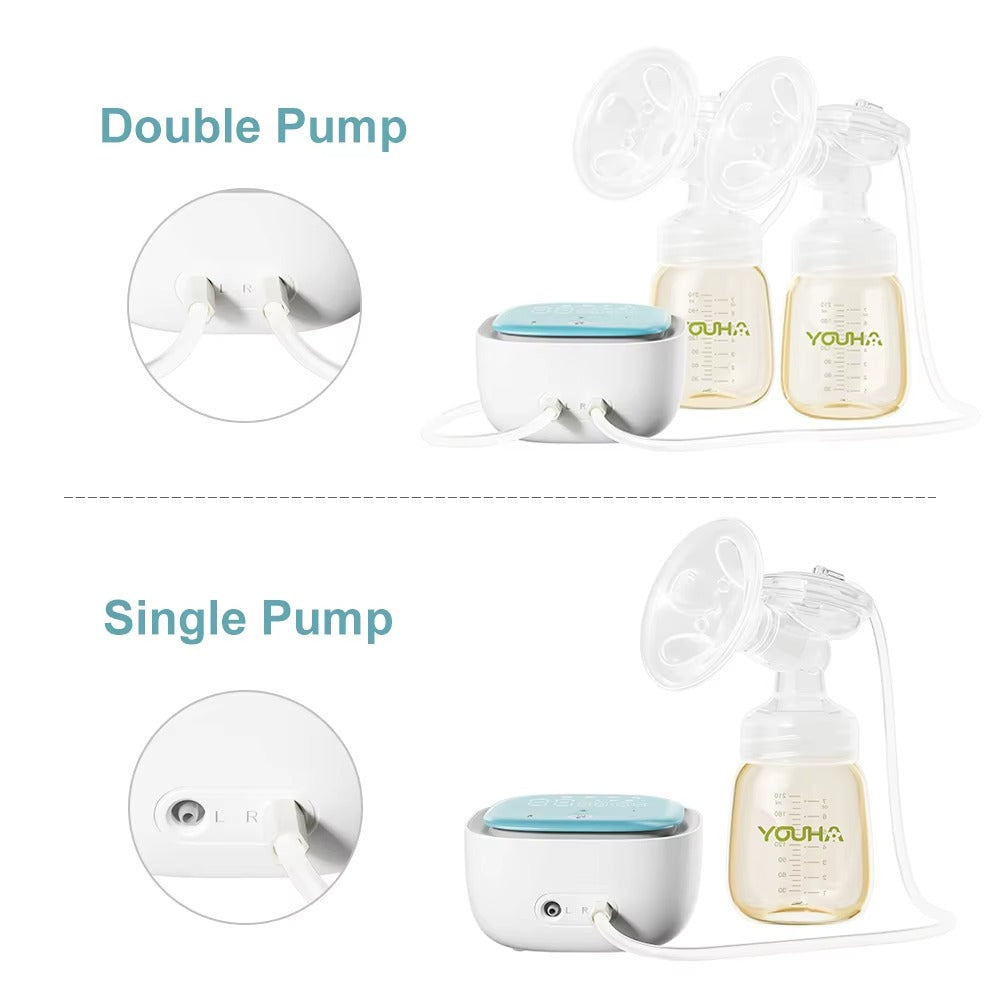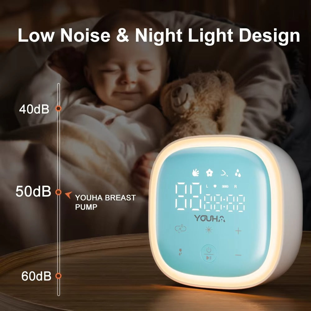 Youha Empower Double Electric Breast Pump is designed to deliver a more natural and comfortable pumping experience through double pumping with alternating suction that mimics a baby’s natural rhythm, helping mums express milk more efficiently with less fatigue. It features an intuitive touch panel with multiple modes and adjustable levels, allowing smooth transitions from stimulation to expression and finishing, while quiet operation and a built-in night light make it ideal for discreet day or night use. Powered by a long-lasting 3000mAh rechargeable lithium battery, this lightweight and portable pump is suitable for both home and on-the-go use, is compatible with milk bottles and milk cups, and is made from BPA-free, food-grade materials for safe and confident daily pumping.