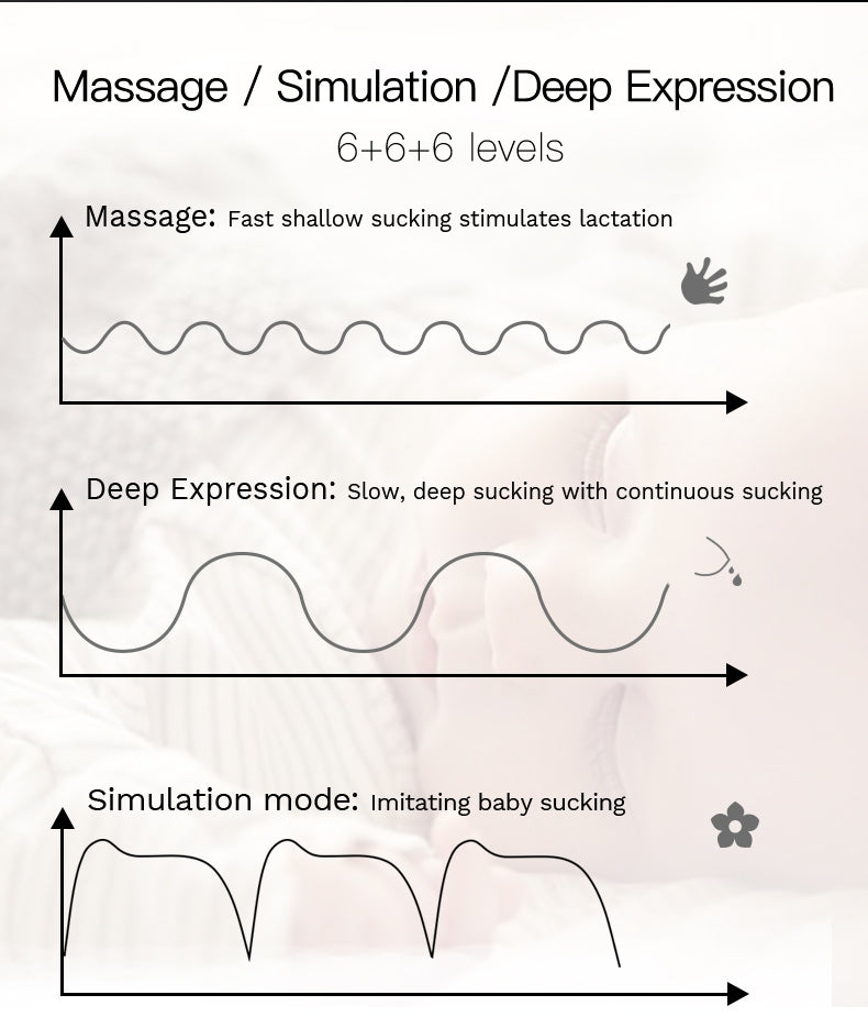 - 3 main modes: Massage (prepare the breast for pumping), Simulation (imitates regular baby sucking rhythm), Deep Expression (slower, stronger, continuous suction, not recommended for beginners)