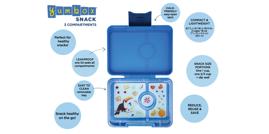Yumbox Snack 3-compartment snack box. Perfect for anyone that packs healthy snacks. It offers variety and promotes healthy eating habits. Its compact size and illustrated tray make every snack time an adventure in good nutrition.