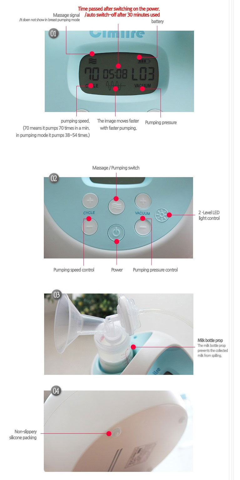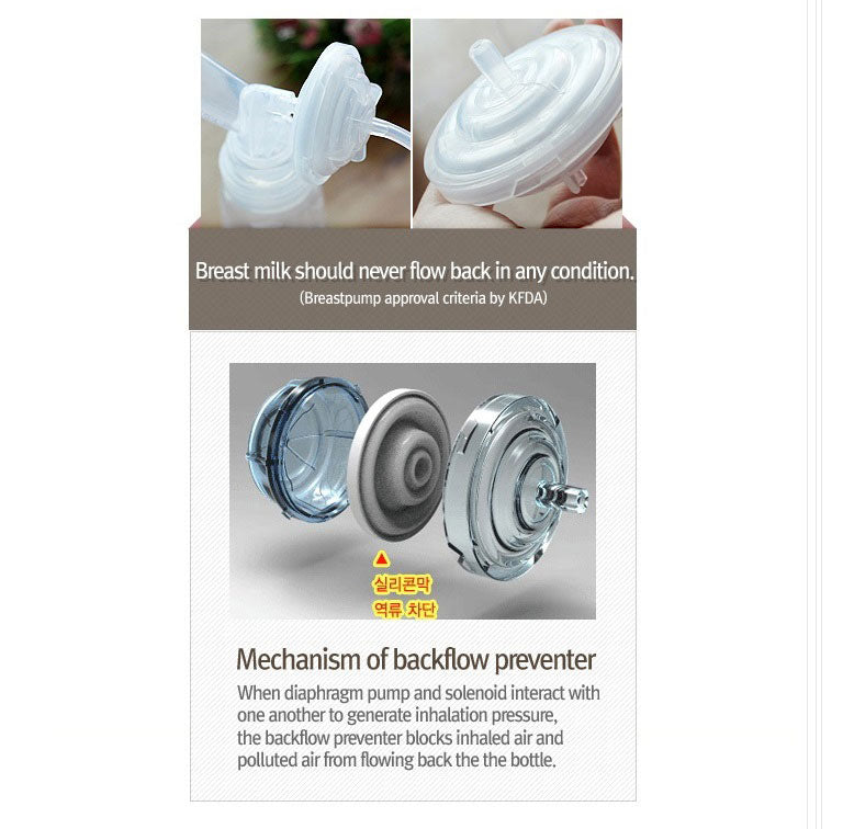 With the innovative invention and thoughtful design for the mummies, including a closed system backflow protector that prevent milk from flowing into pump motor, a safety automatic power- off after 30 minutes system, individually adjustable settings for cycle (speed) and suction, massage (Let Down) mode allowing stimulation of body's let down reflex, double sided pumping to saves so much time with faster milk production, quiet, pumping next to your sleeping baby without disturbing and a 2 level LED lighting that enables you to see the function on the LCD display clearly during the night time. One great thing about this product is it come with a built in battery, mummies do not have to worry about not having power plug.