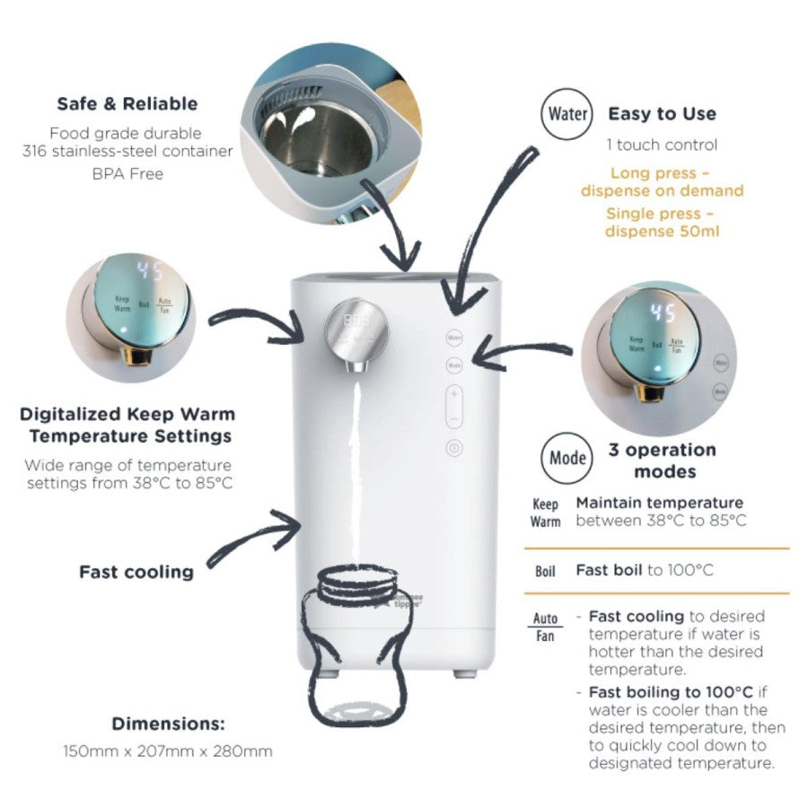 - One touch boiling to 100°C & keep warm to pre-set temperatures with speedy cooling feature